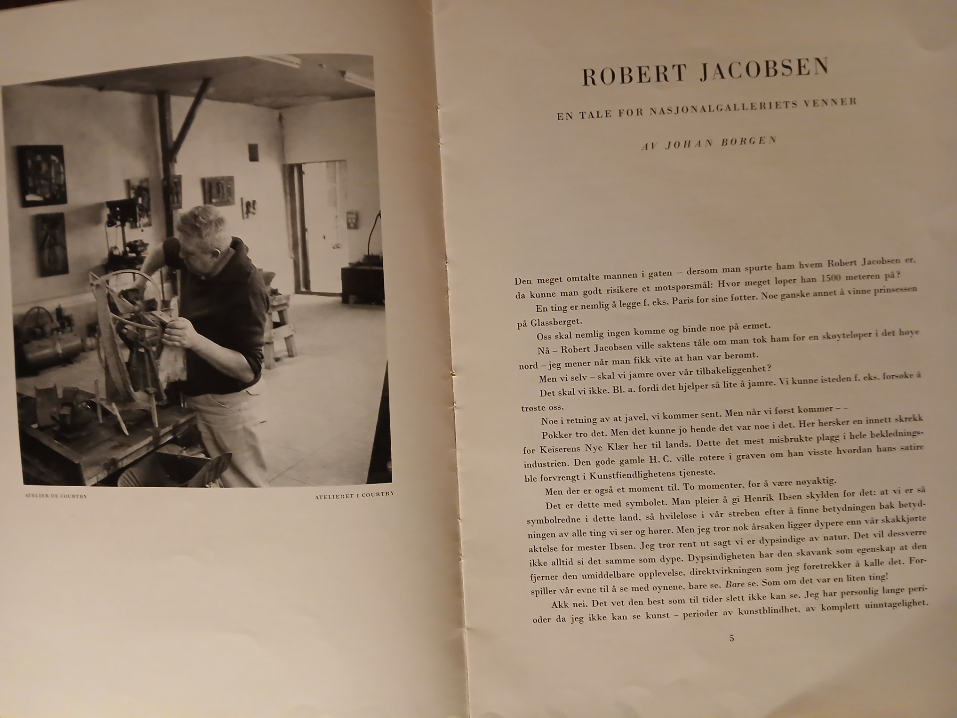 Skriftens författare inleder med att konstatera att Robert Jacobsen först blev känd utomlands men långt senare i sitt hemland. Han syftar på att Jacobsen tidigt i sitt konstnärsliv flyttade till Paris och där verkade bland de konstnärer som under 1900 – talets mitt arbetade inom den abstrakta konsten. "En ting er nemlig å legge f. ex. Paris for sine fötter. Noe ganske annet å vinne prinsessen på Glassberget."