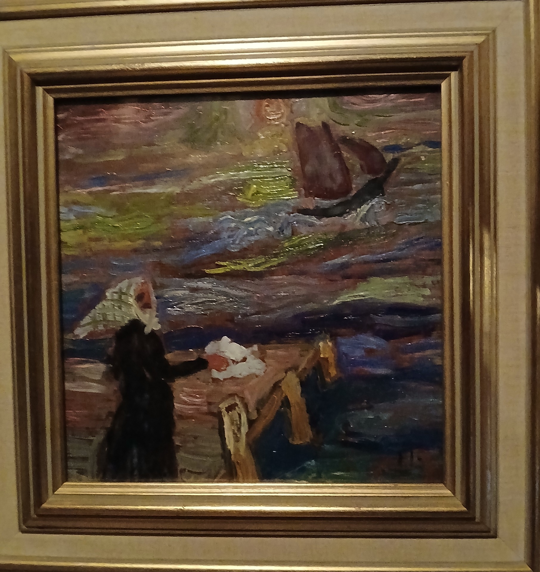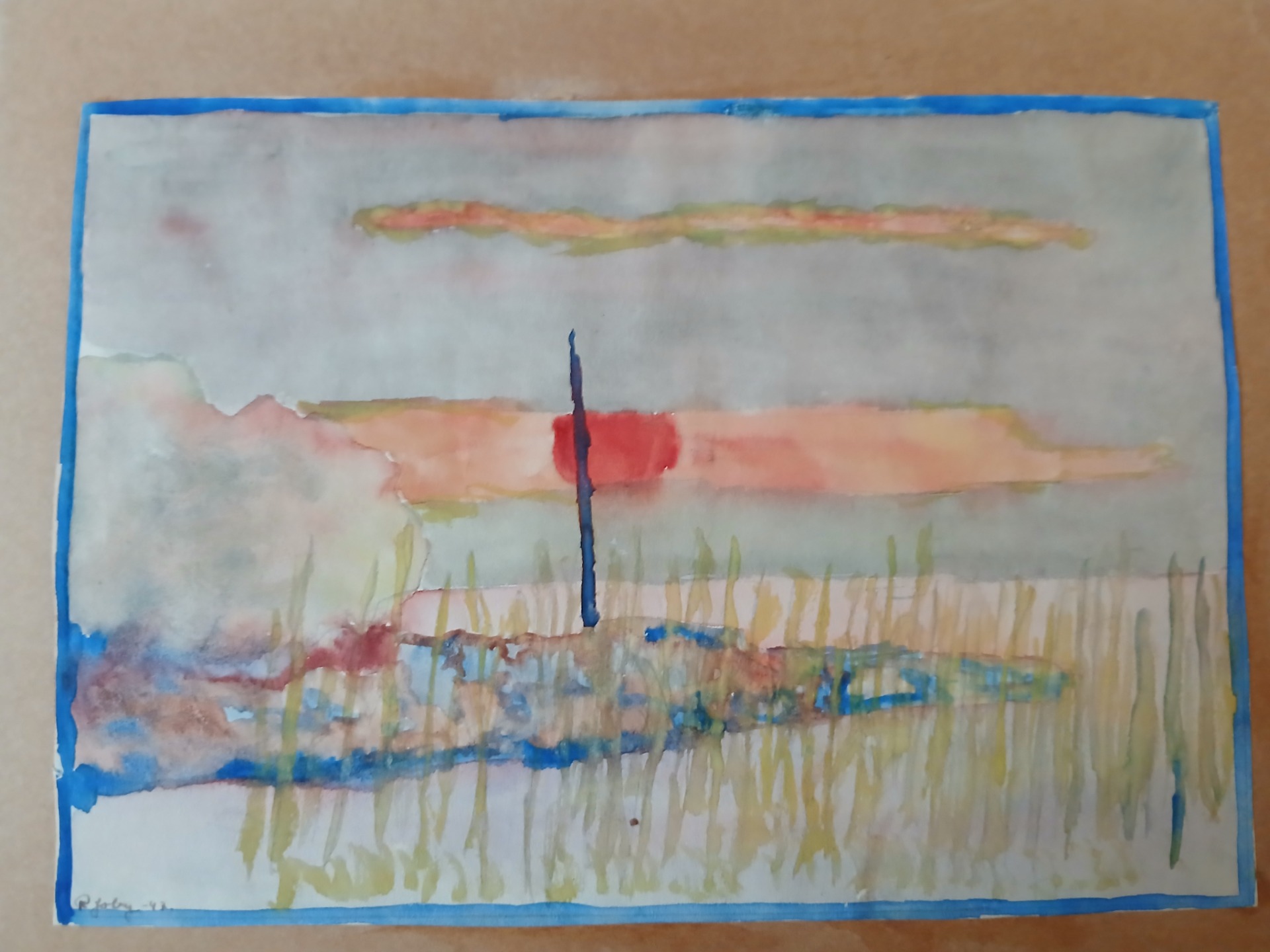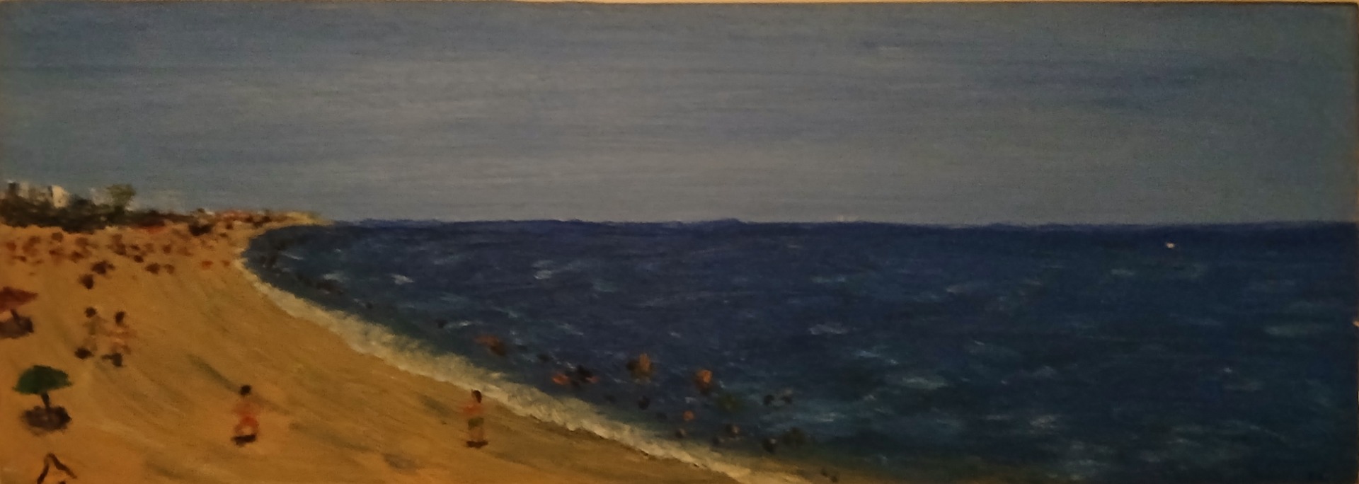Min första oljemålning. 1975. "Badstranden i Italien". 12 x 30 cm. Målad på en skokartong.