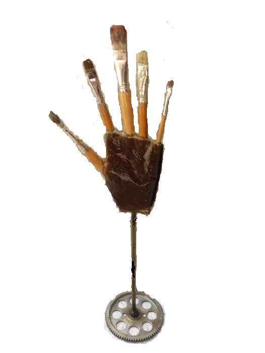 Jag har mycket material för oljemålning i min ateljé. En dag tittade jag på pappas penslar. Det var ganska många. Man skulle kanske göra en skulptur i skrot och penslar. Sagt och gjort. Det blev en skulptur som fick heta "Målarens hand".
