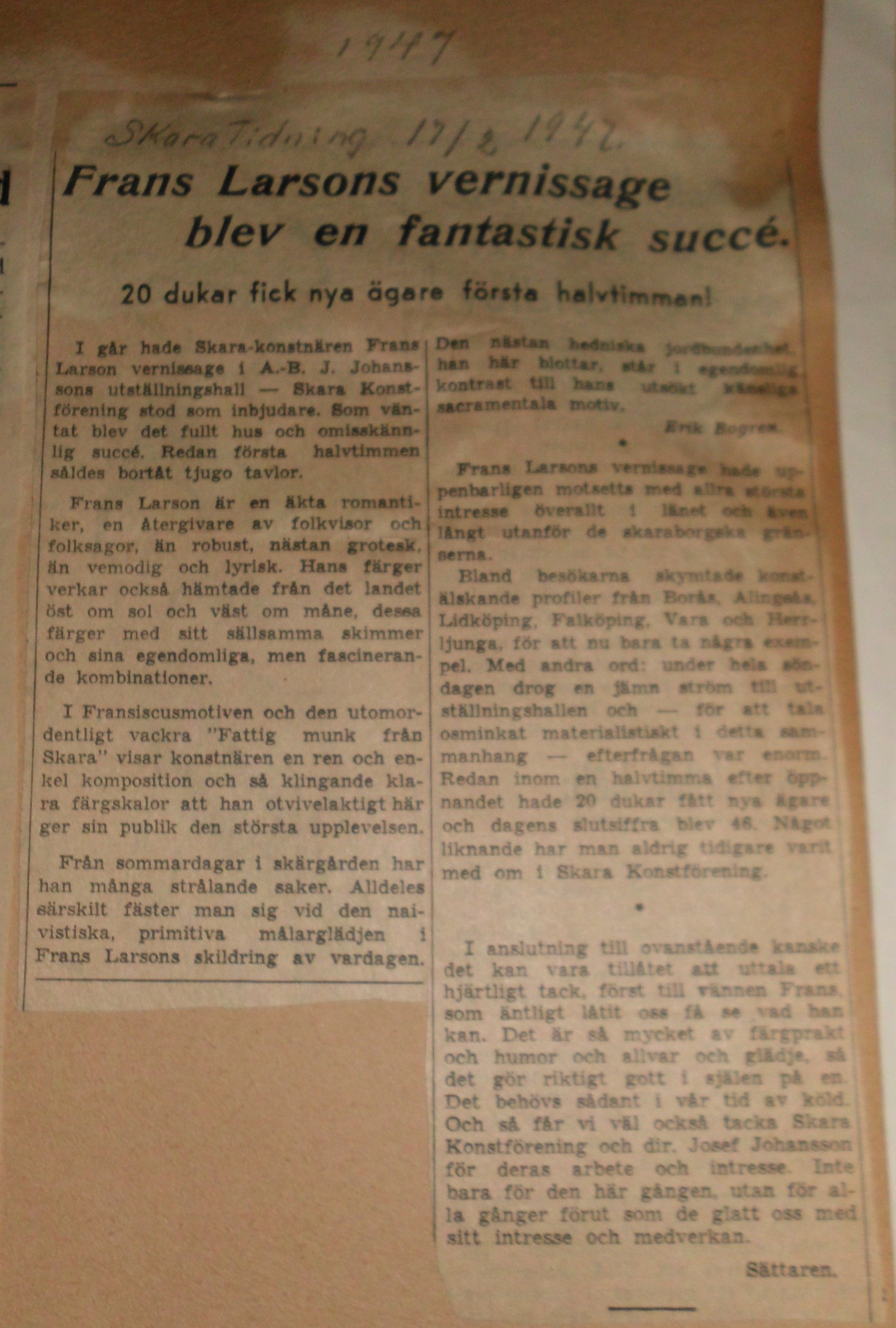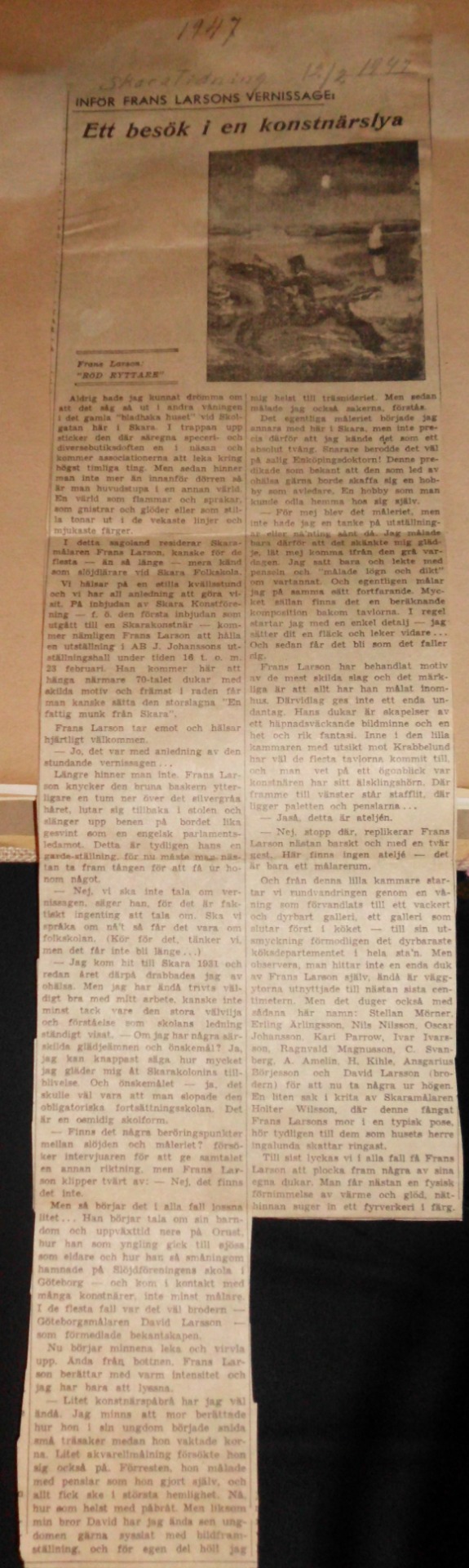 I artikeln från 1947 berättas det att Frans Larsson haft utställning i Skara konstförenings regi och att hans målningar blev mycket uppskattade. Det kom många besökare och bara under första halvtimmen såldes 20 tavlor. Sammanlagt såldes 46 tavlor.