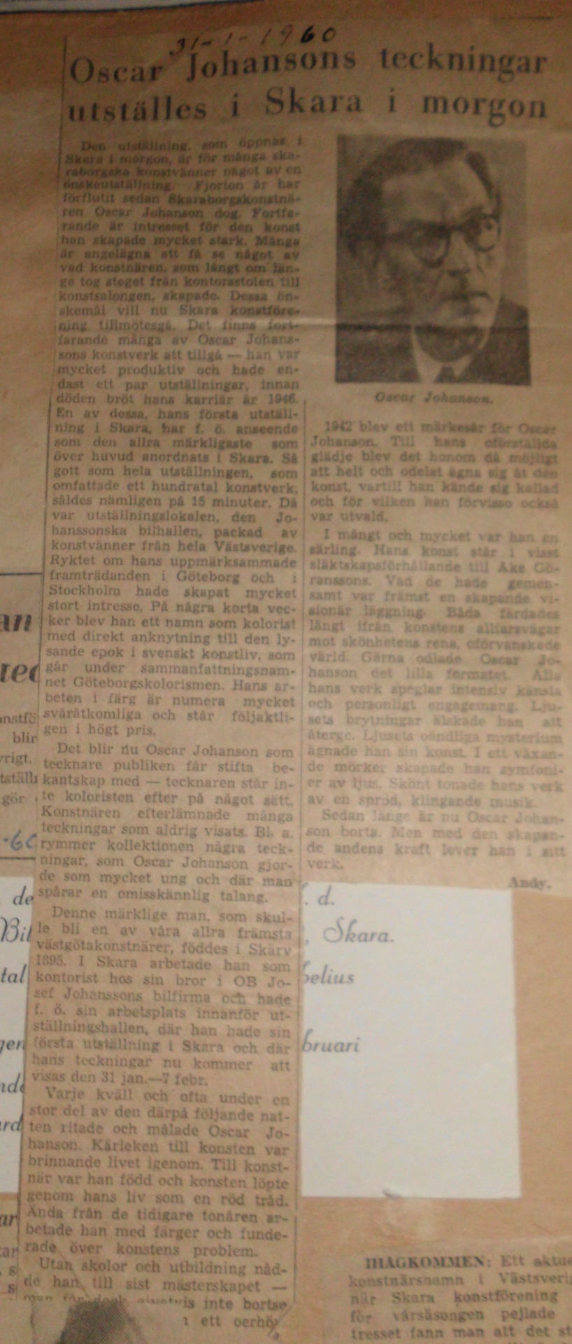 Artikeln berättar om en minnesutställning 1960, av Oscars tavlor. Den pågick från 31 januari till 7 februari och anordnades av Skara konstförening och beskrivs som föreningens mäktigaste utställning med hundra målningar.