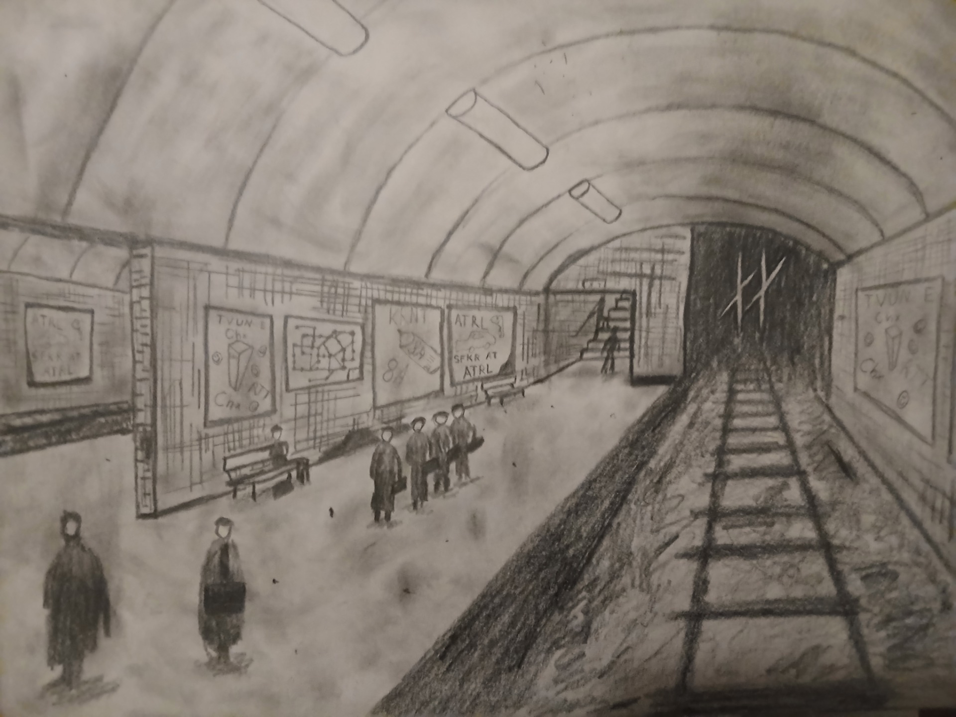 Jag associerade direkt med storstäder jag besökt under alla mina resor och i alla Europas storstäder finns det tunnelbana. Jag gjorde en bild ur mitt minne av en tunnelbanestation i London. Ritade också dit några små "byråkrater" med portfölj som typiska pendlare.