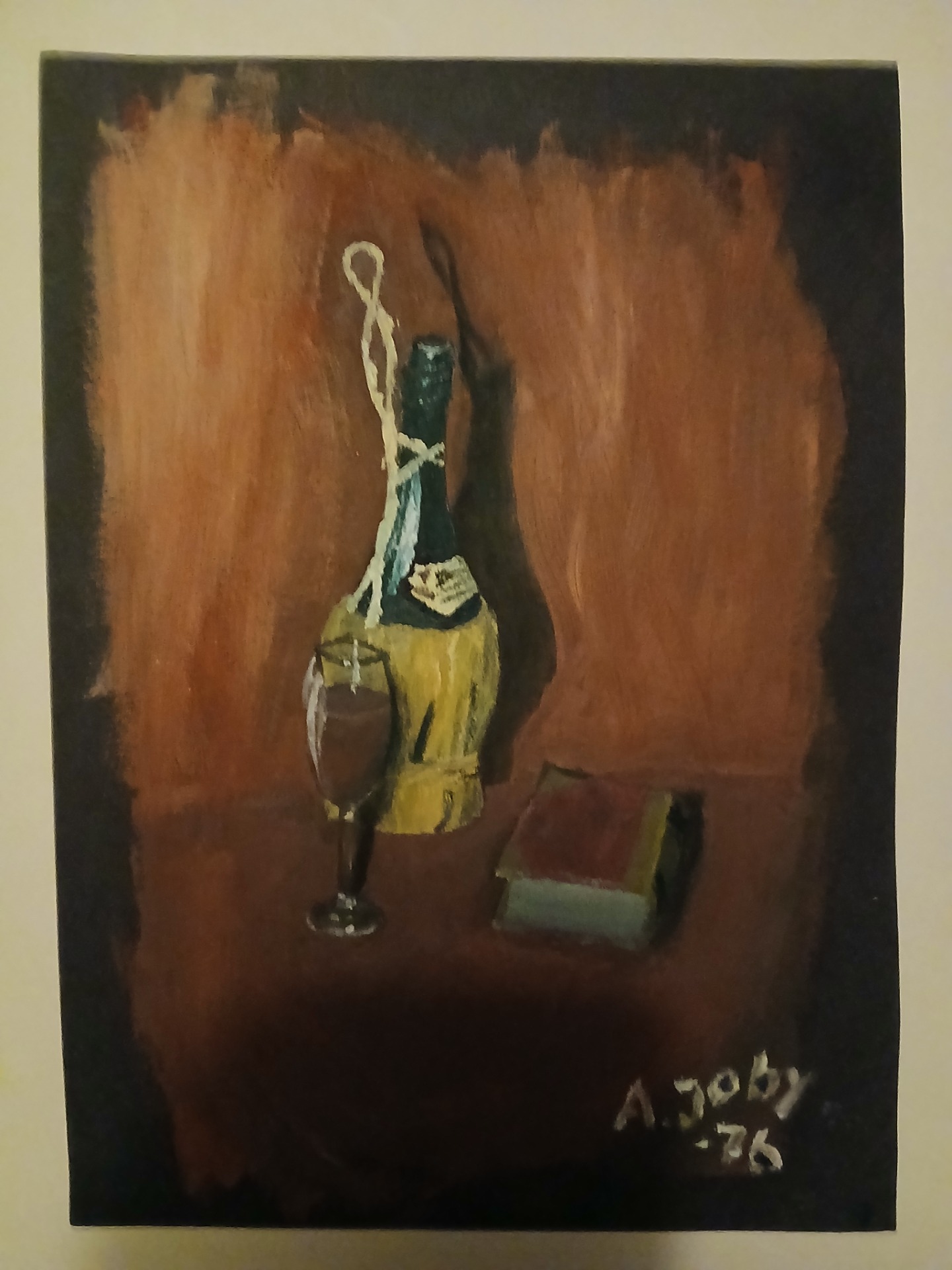 Hemma målade jag med pappas penslar och färger. Det blev ofta tråkiga stillebenmotiv men det var nyttiga övningar för att lära känna oljefärg. Bilden med vinflaskan målade jag på svart kartong, bara för att experimentera med att måla som de gamla medeltidsmålarna som utgick från en svart yta.