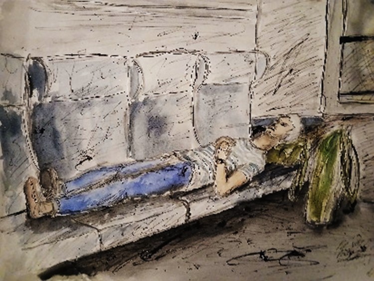 Akvarell. Självporträtt. "Ensam i kupén, och äntligen på väg ner i Europa".