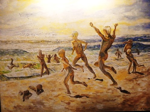 Jag målade min egen kopia på en av mina favoriter i konsthistorien. Den är gjord av en av Skagenmålarna, Kaj Willumsen, och heter "Sol och ungdom". Ett av originalen hänger i källaren under konstmuséet i Göteborg. 1 x x1,5 meter.