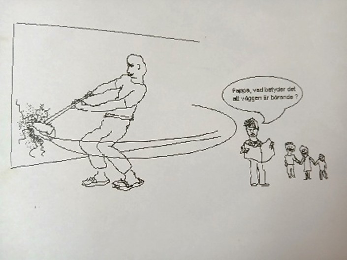 Datorbild. "- Pappa, vad betyder det att väggen är bärande?"