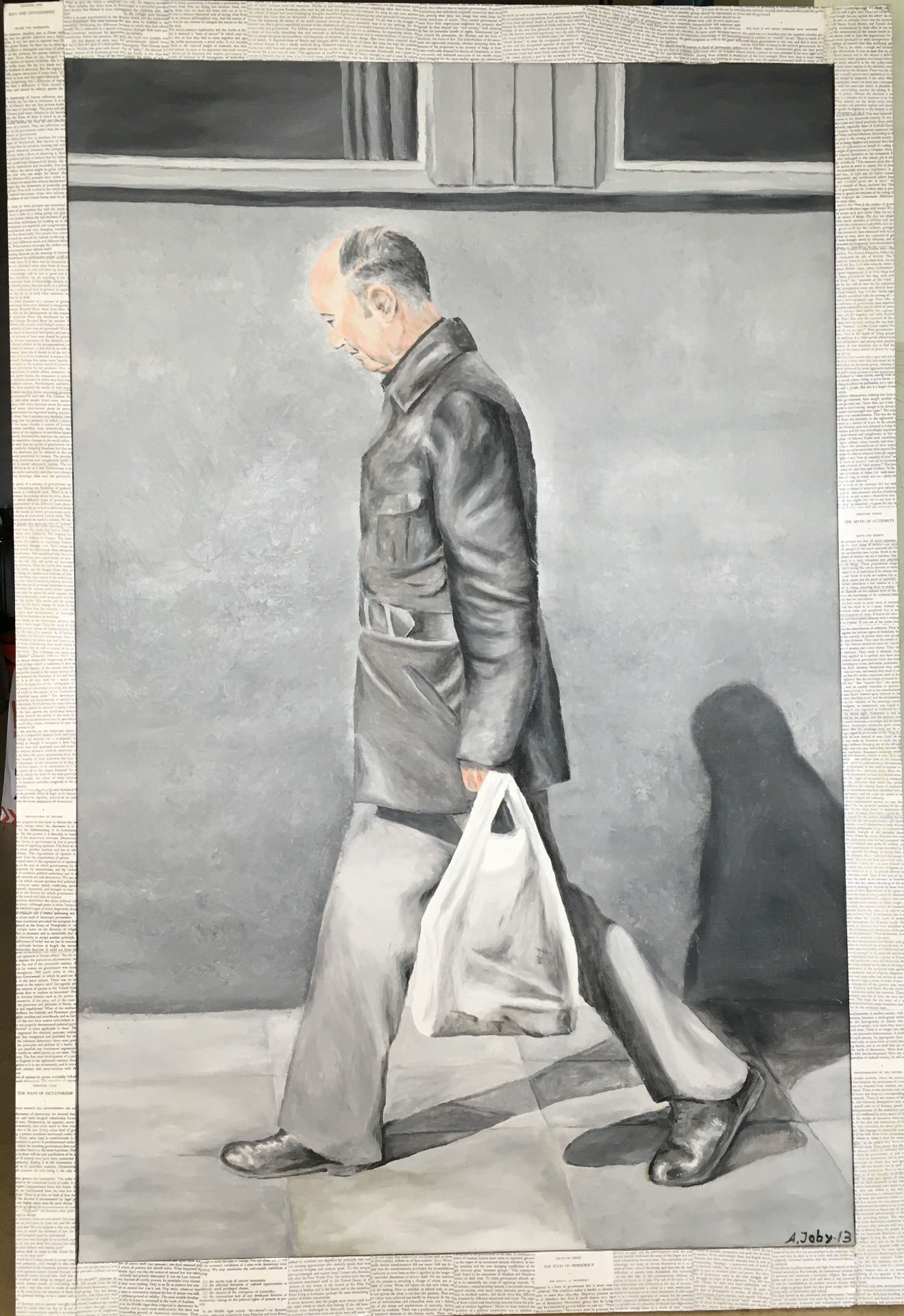 Förlaga är ett fotografi jag tog i en Stockholmsförort när jag gick på konstskolan i Stockholm och vi hade fått uppgift att åka ut och fotografera staden. Den gamle mannen har varit och handlat mat. Han är nog på väg hem till sin lägenhet i ett höghus av betong. Ett enkelt liv. En enkel man. Men i hans inre finns en hel värld av tankar. Han är en filosof av stora mått. Ramen består av texter om statsvetenskap av en världsberömd filosof, Robert MacIver.