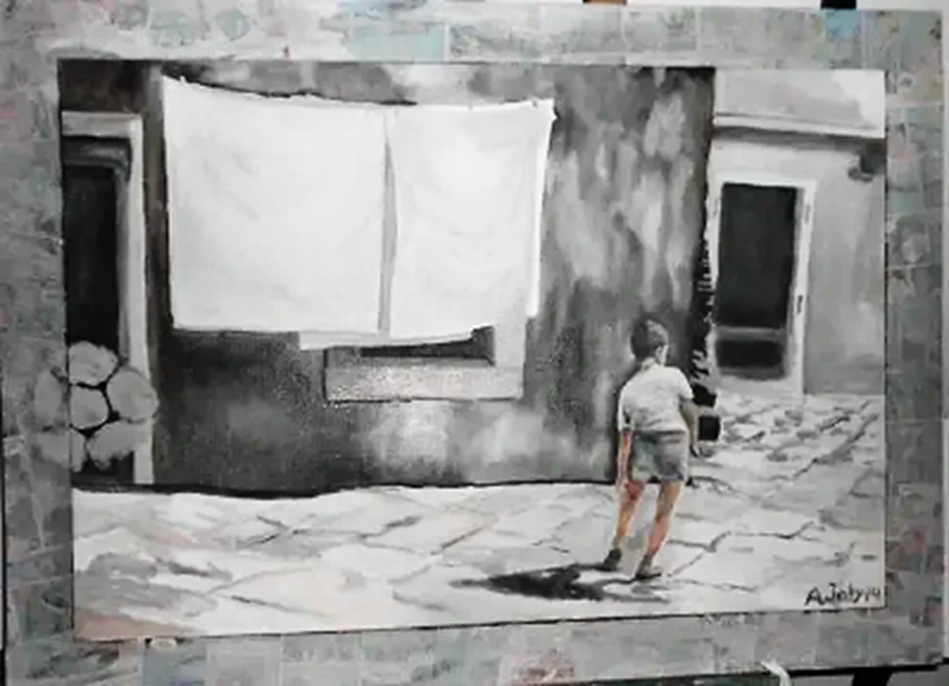 Förlaga är ett fotografi jag tog i Kroatien under en av mina motorcykelresor till medelhavet. Pojken har sparkat boll mot väggen och ska nu gå hem. Ramen består av olika seriebilder från en gammal serietidning och på vänster ram gjorde jag ett avtryck av en fotboll. Bilden ska visa den unga pojkens dagar fulla av spel och lek.