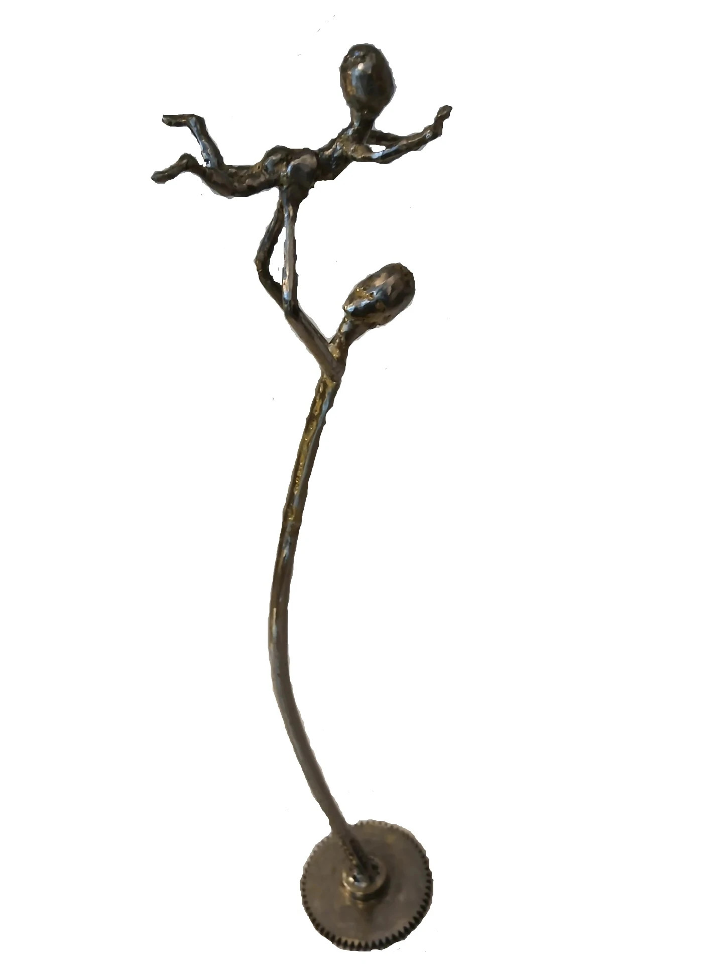 Figur av rostigt järn och gammalt kugghjul. Ibland slipar jag bort all rost för att få en annan yta och ett annat uttryck i en figur. När en skulptur är klar lackar jag den alltid med en hård lack för att få en lyster i ytan. Denna är gjord som en hyllning från alla barn till sina pappor. I basen är det ett kugghjul som symbol för det kontrollerade tänkandet och i toppen är barnet som symbol för den spontana känslan och livsglädjen.